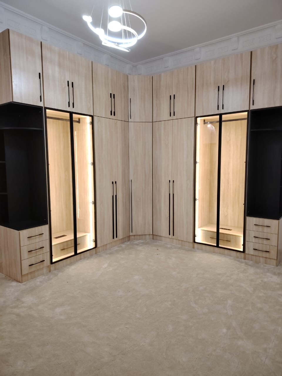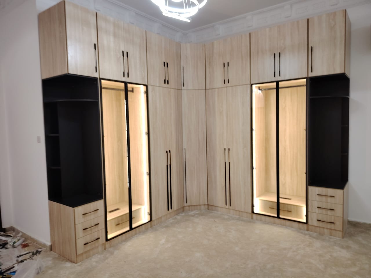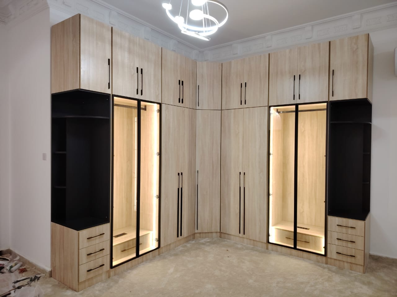 كبت ( دولاب ) بت من الميلامين ١٨ مم تايلندي والقشرة تلبيس عمان طول ٣ مم على شكل L الابواب سادة باب الرواية فريم المنيوم اسود مع زجاج مع انارة لبداية الكبت والنهاية والزاوية فقط