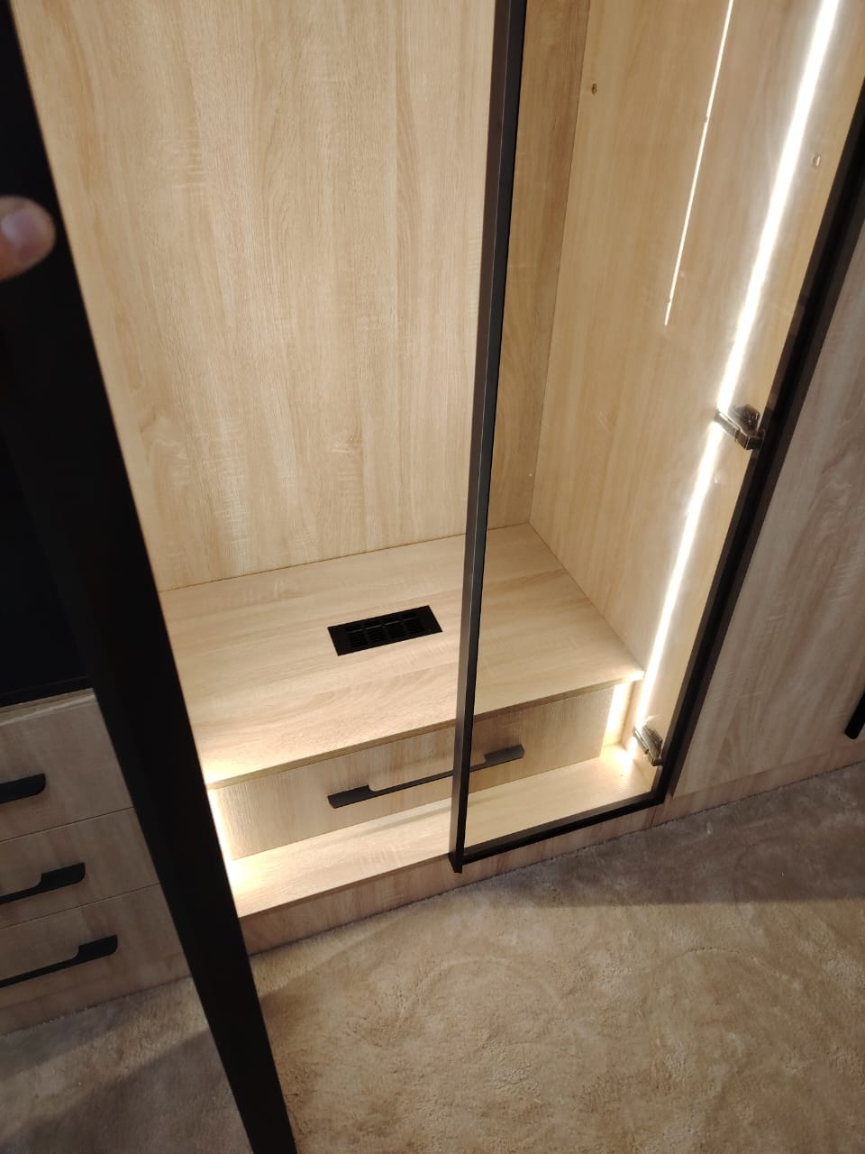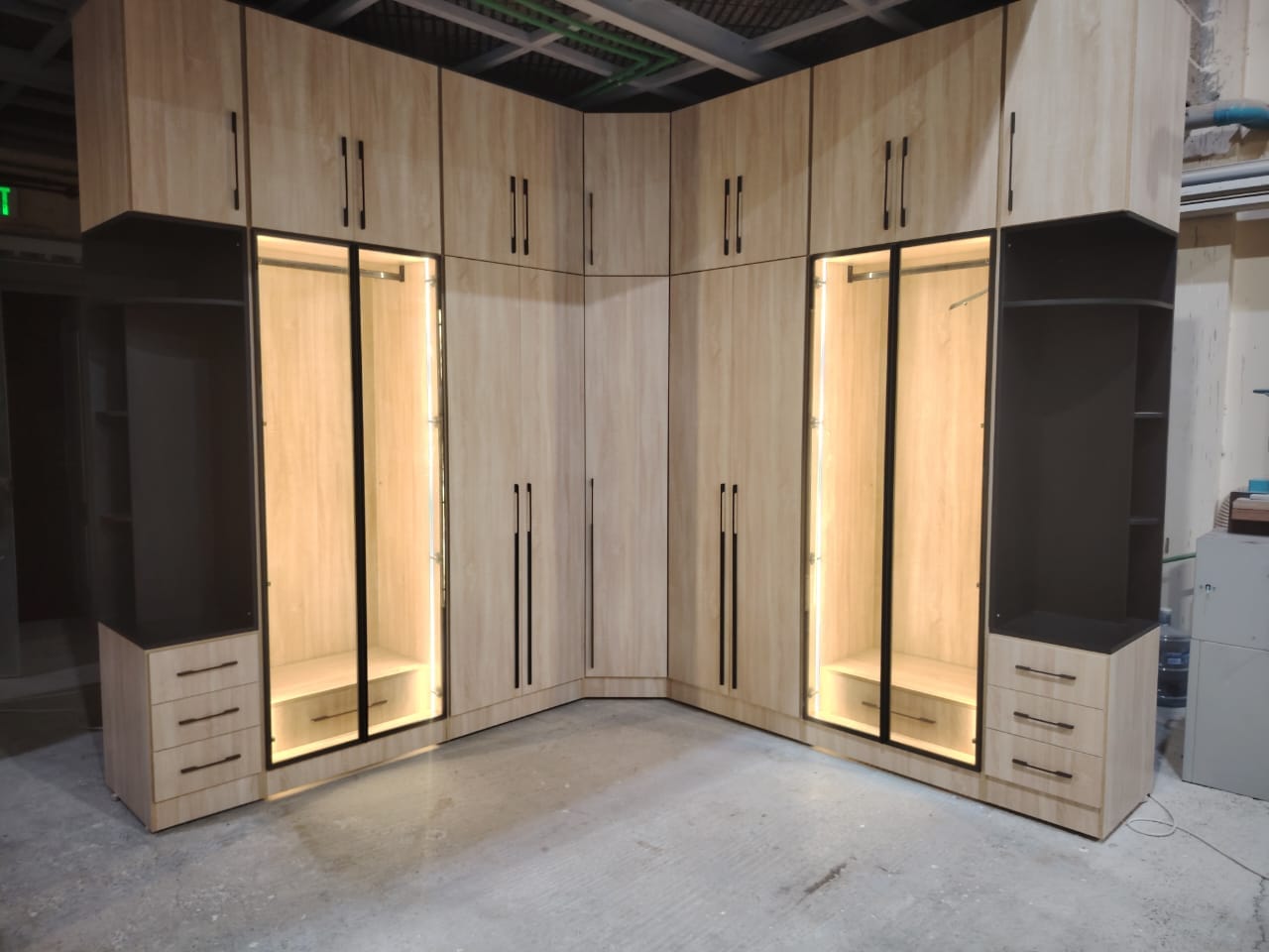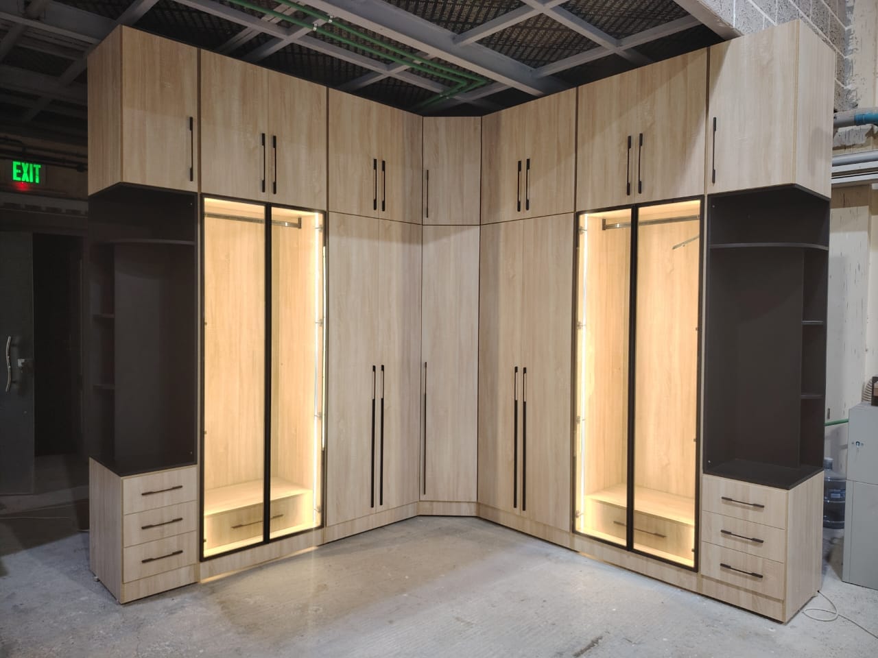 كبت ( دولاب ) بت من الميلامين ١٨ مم تايلندي والقشرة تلبيس عمان طول ٣ مم على شكل L الابواب سادة باب الرواية فريم المنيوم اسود مع زجاج مع انارة لبداية الكبت والنهاية والزاوية فقط